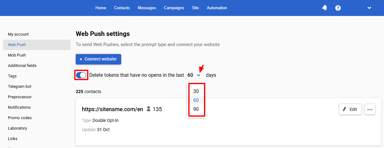 Enable the option to automatically delete inactive tokens after 30, 60, or 90 days to keep only those users who interact with the campaigns.