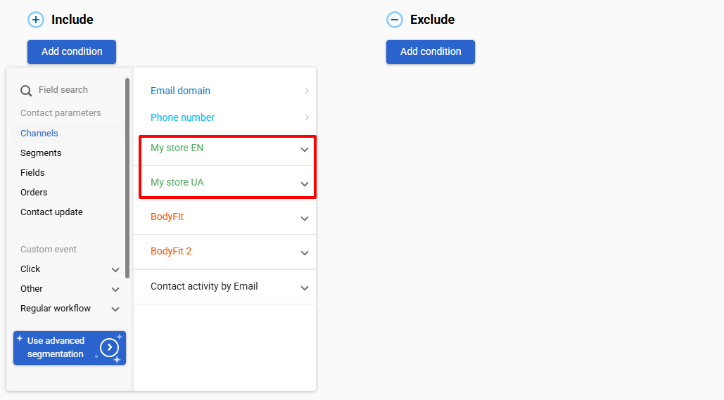 NoteThe Website name field can be used to create dynamic segments, as well as for searching and filtering contacts within a list.