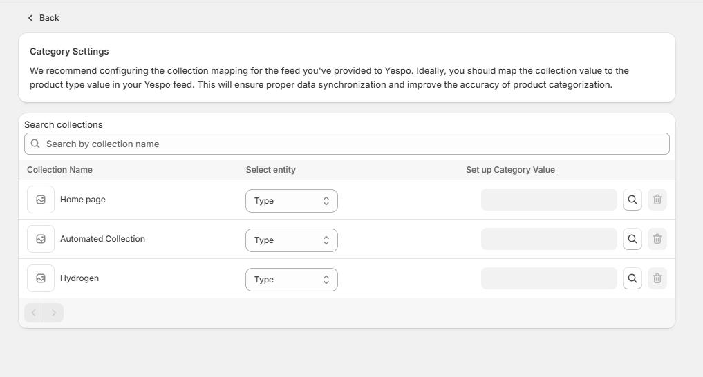 CategoryPageevent. - In the Select entity column, for each collection, select the entity type (Type / Category) that you use in the product feed as the