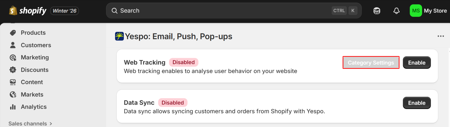 CategoryPage Event SettingsAfter enabling web tracking, click Category Settings.