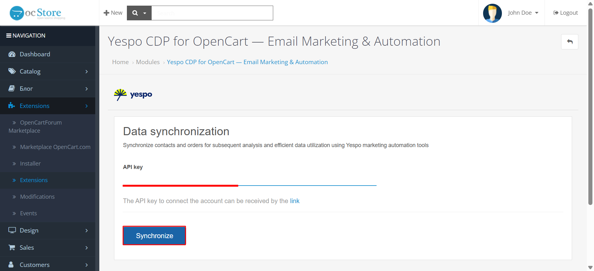 - Enter your Full Access to API key from your eSputnik account and click Synchronize.