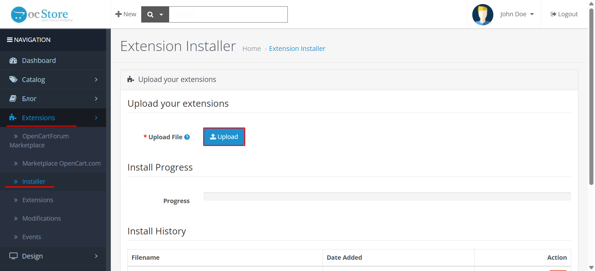 - Go to Extensions ā Installer, click Upload, and select the downloaded file. Wait for the success message.