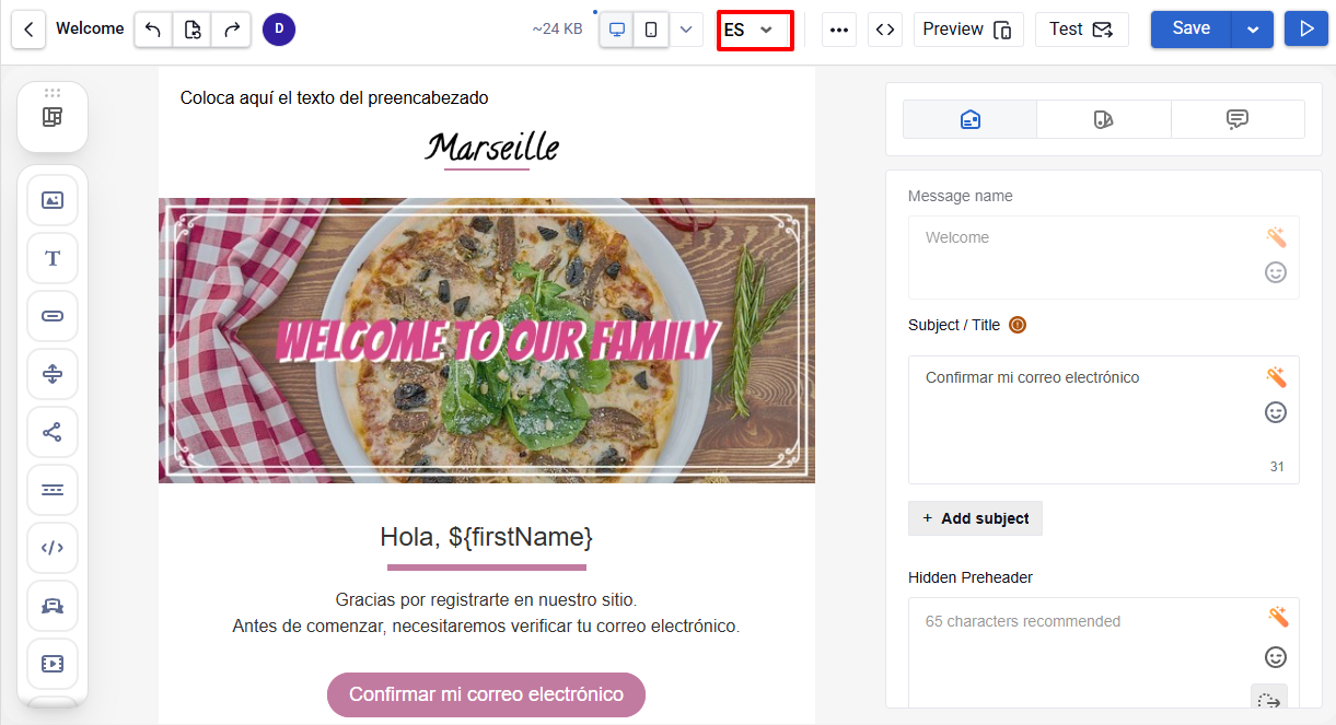 - In the message editor, click the language switcher.