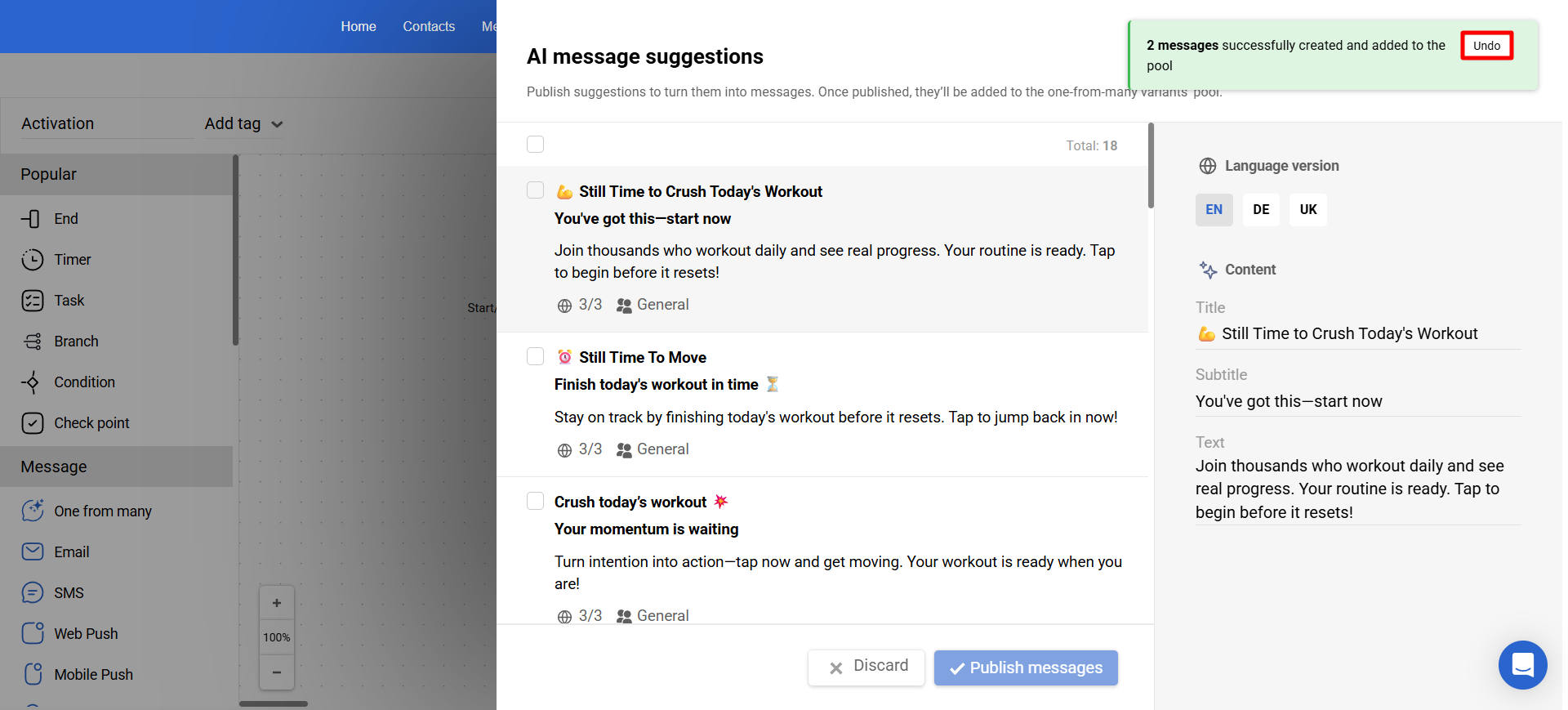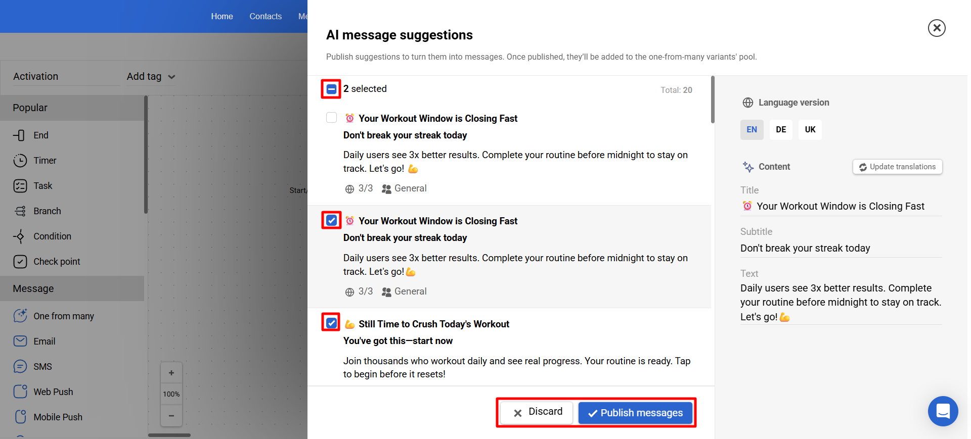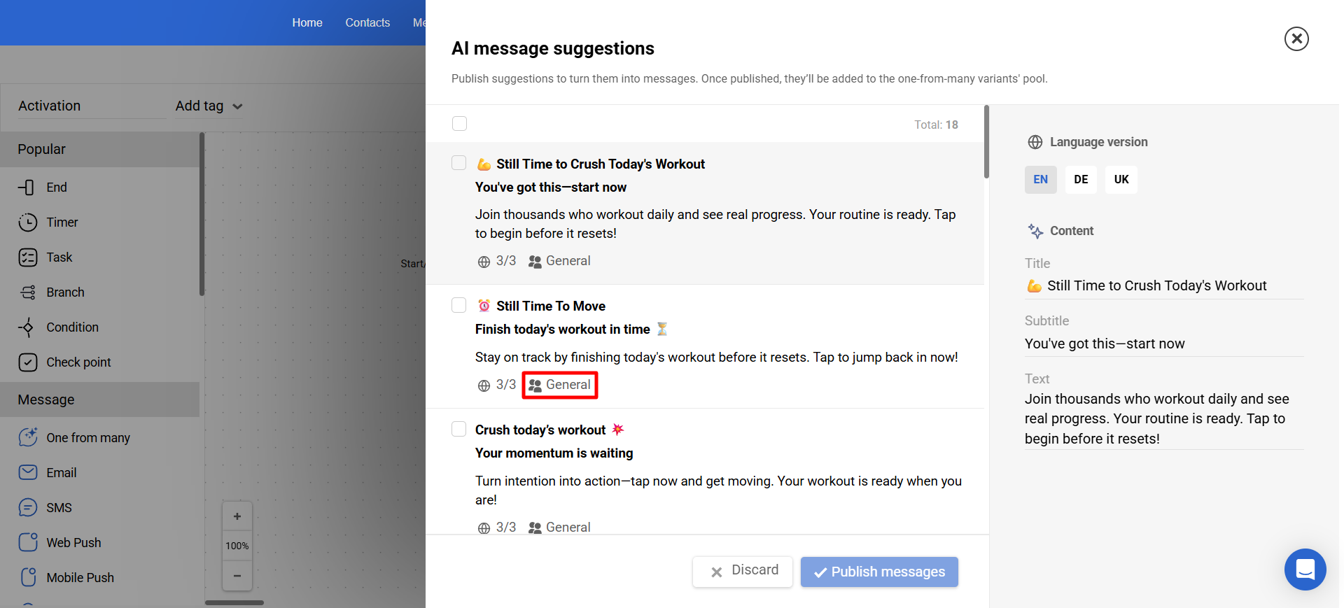 Generated suggestions are displayed in the right sidebar, where you can review them and then accept or reject them. Accepted suggestions will be added to the message pull in the block and will also be created in the general Mobile Push list.