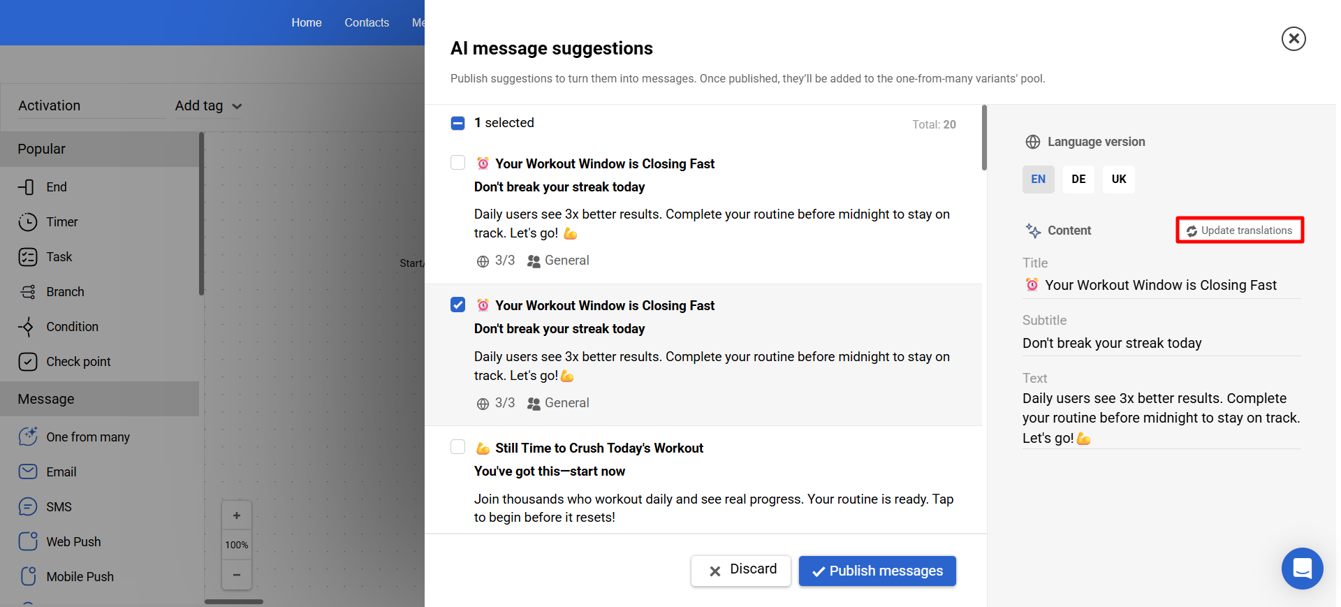 In the One from many block, you can automatically generate variants and translations of Mobile Push messages using built-in AI. The algorithm generates new texts based on the messages available in the block — this helps you create high-quality content faster, focusing on real contact reactions or available templates: