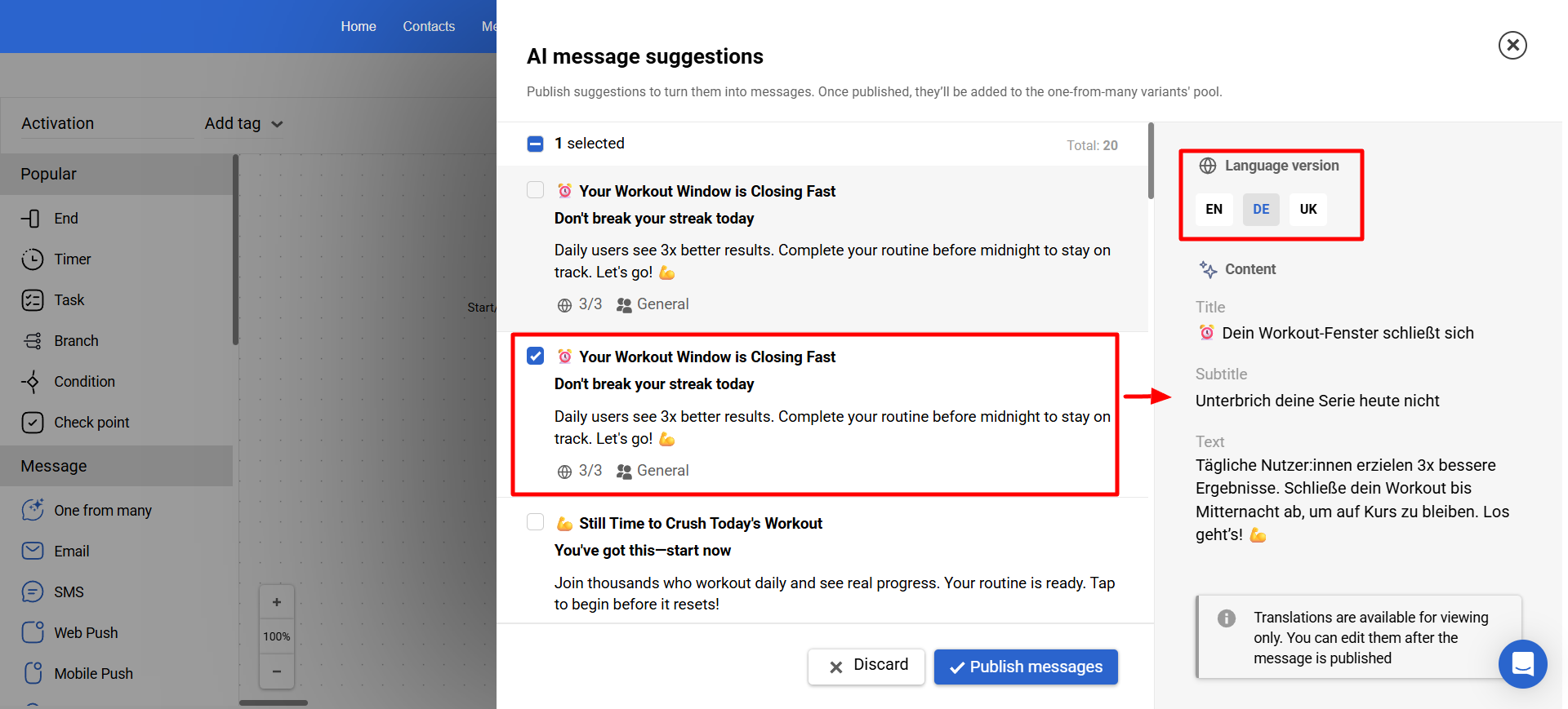 Using AI in message creation also saves time and effort — from writing high-converting texts to automatically translating multilingual versions.