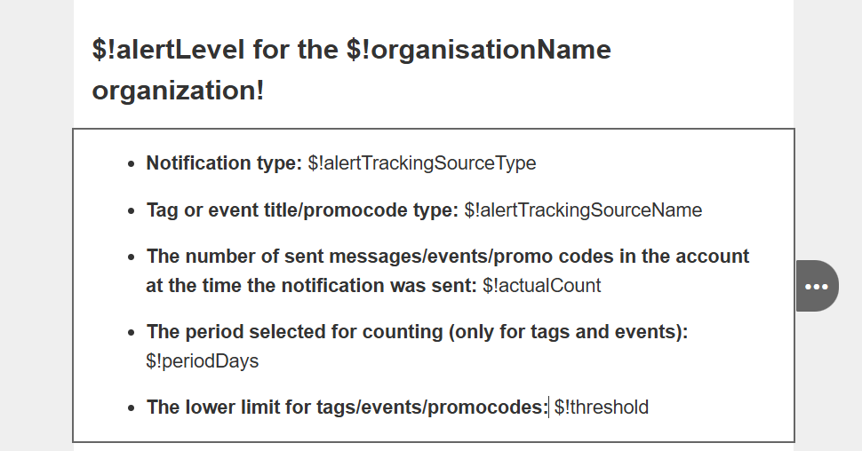 $!alertTrackingSourceName - The number of sent messages/events/promo codes in the account at the time the notification was sent: