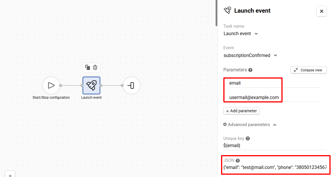 ${phoneNumber}. If you have a different name for the variable in the event, specify it in the field. - JSON: field contains a line or a variable with a line in JSON format with contact data (phone number, name, surname, city, additional fields). Email address is specified by default; if needed, specify other additional data. The parameter confirmed is ignored.