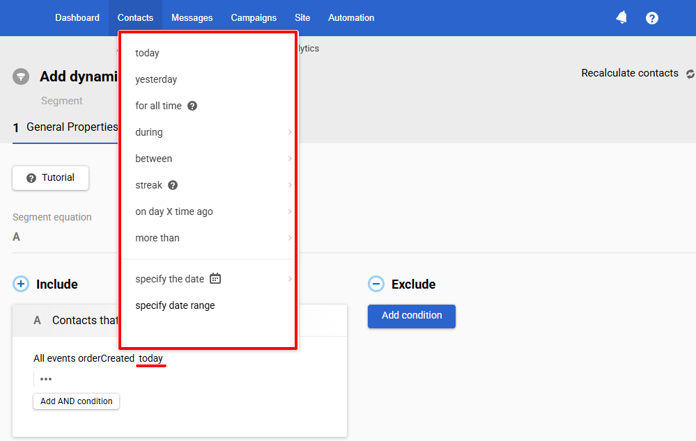Set up segmentation by events so that custom events and their parameters are recorded in contact cards and can be used to create dynamic segments.