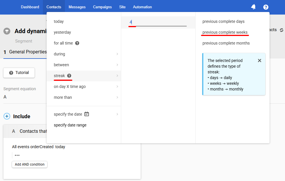 Streak – used to check the regularity of events and allows you to select users who remain active. The event must occur at least once in each of the N previous complete periods in UTC (day, week, or month).