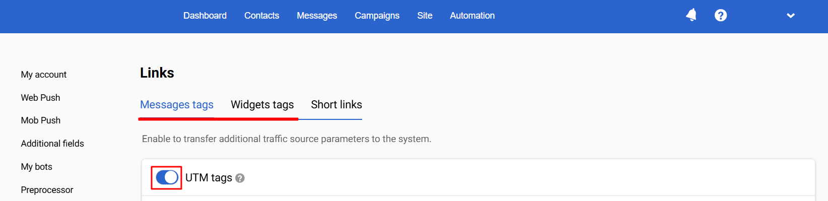 Then activate the UTM tags slider so that parameters about traffic sources start transferring to the analytics system.