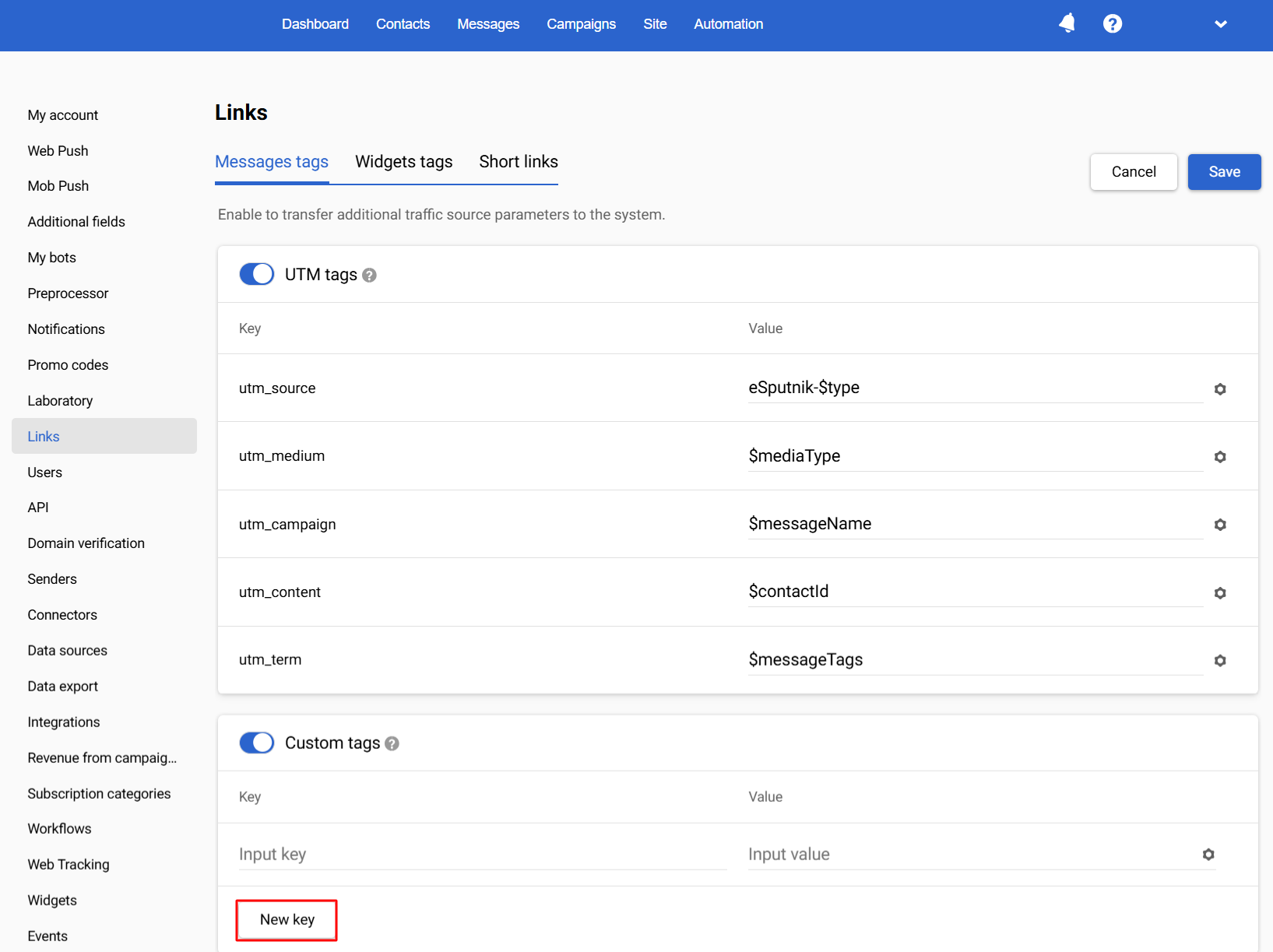 For a global UTM tags parameters configuration go to Settings → Links in your eSputnik account.