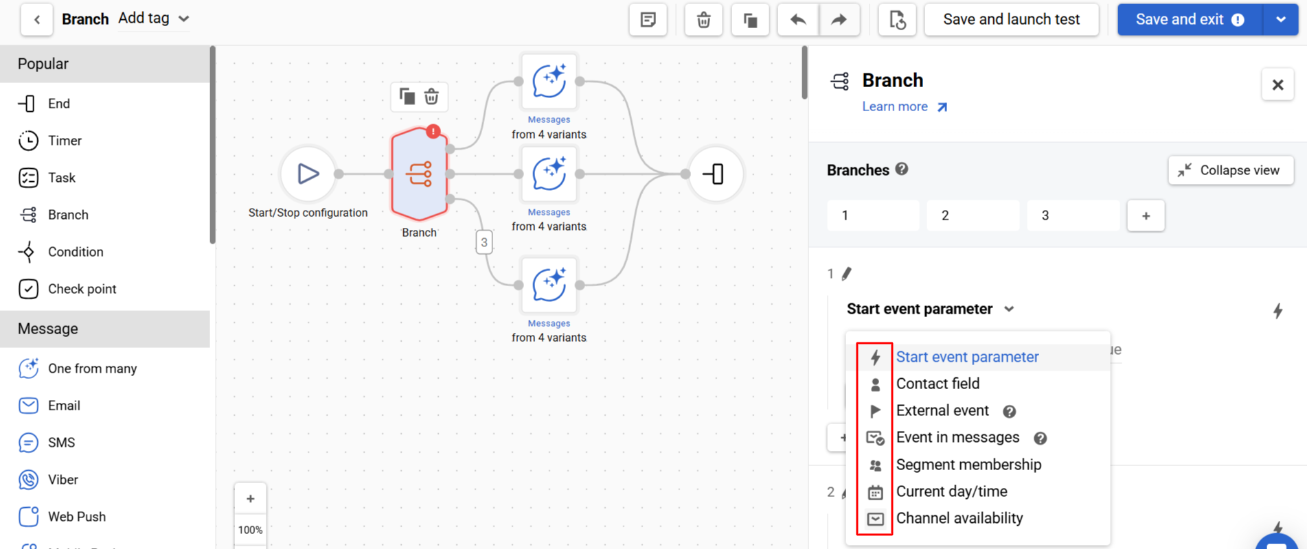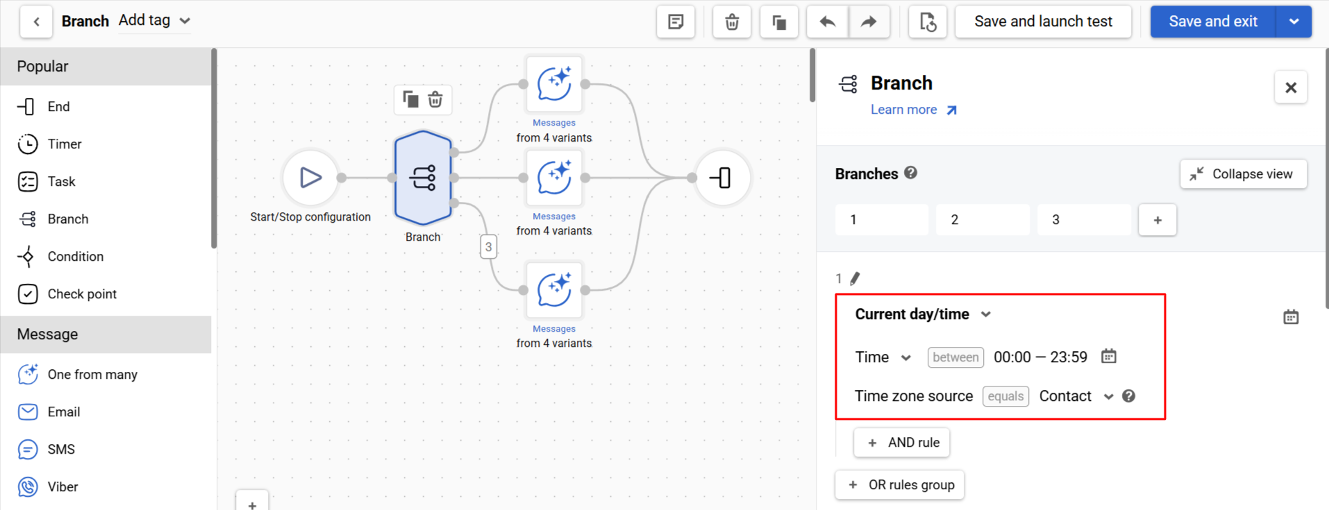 The Branch is a workflow block for defining multiple alternative paths in one place. Instead of chaining many separate Condition blocks (hard to read and maintain), you add branches inside a single block and set rules for each. The system evaluates branches top ā bottom and sends the contact down the first branch whose rules are met. This keeps complex logic clear, compact, and easy to maintain.
