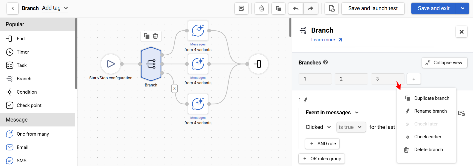 - Duplicate ā copy a branch with all its conditions (using the button in the block settings or selecting the branch and pressing