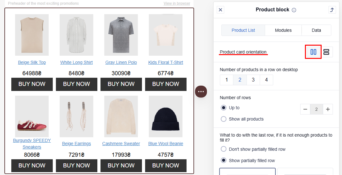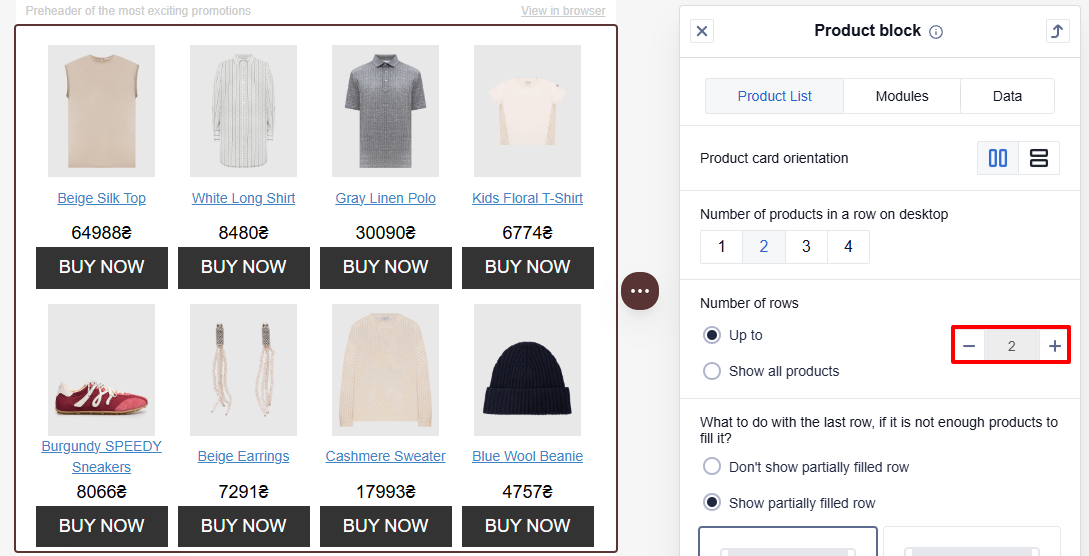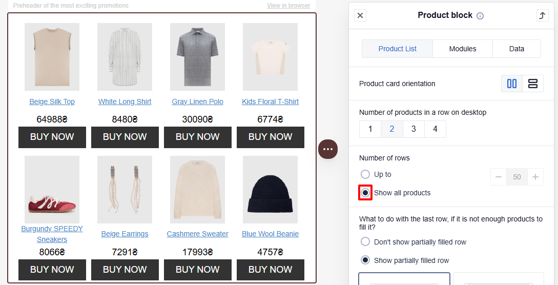 - Show partially filled row: The last row of product cards is displayed for the recipient, even if it contains fewer cards than the value you selected in the Number of products in a row section.
