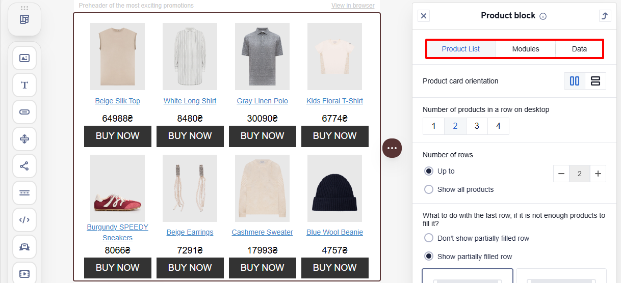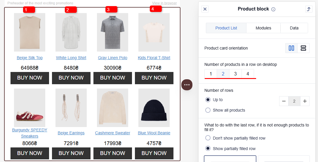 - Don't show partially filled row: If the last row of product cards contains fewer cards than the value you selected in the Number of products in a row section, then this row is not displayed for the recipient.