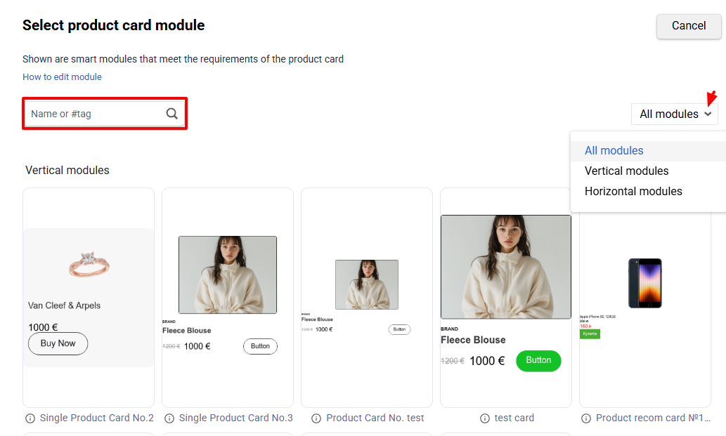 NoteThe selected module type (vertical or horizontal) automatically determines the card orientation in the product block.