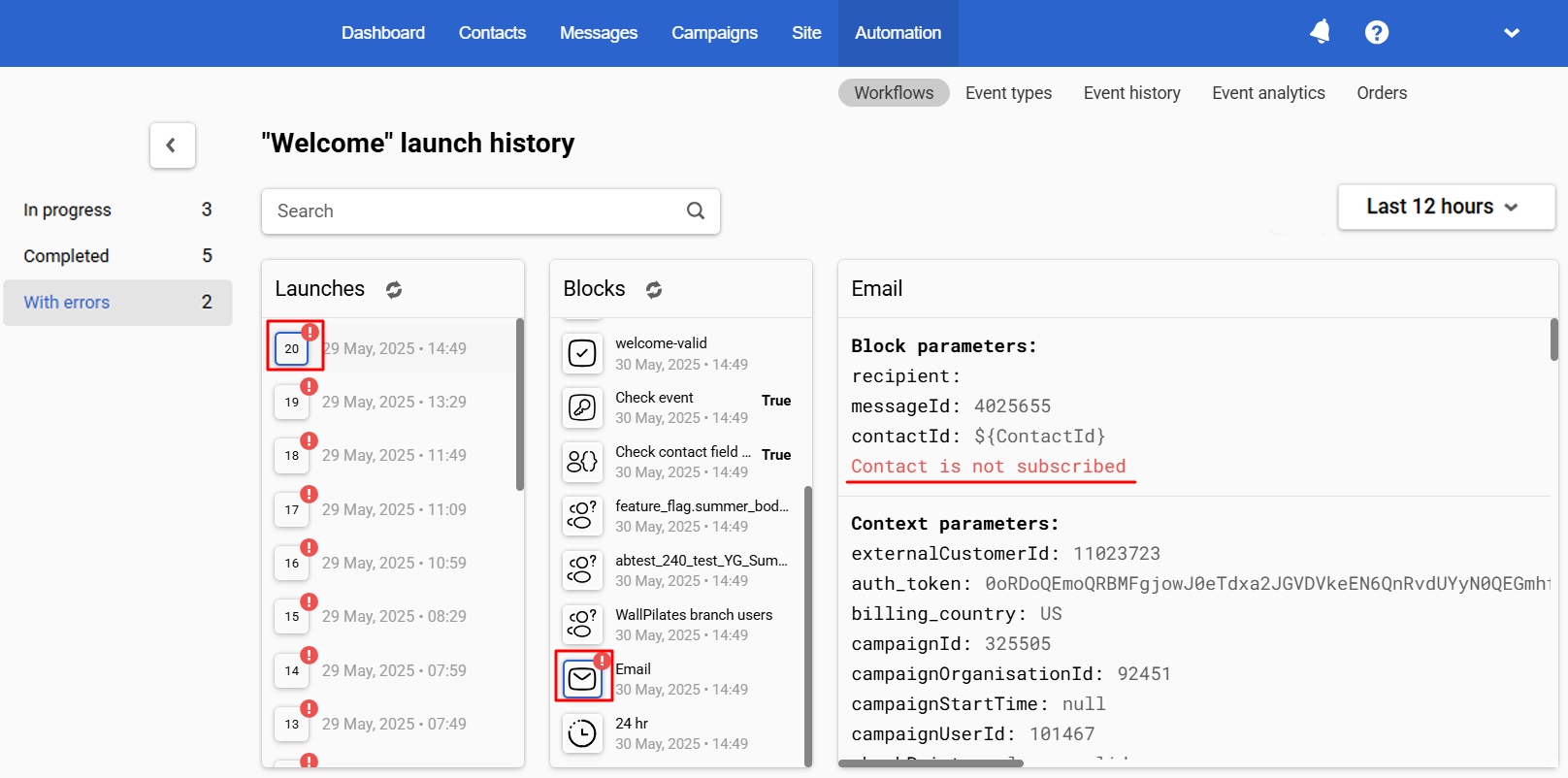 Click on the instance of the workflow with an error, and then select the block with the error.