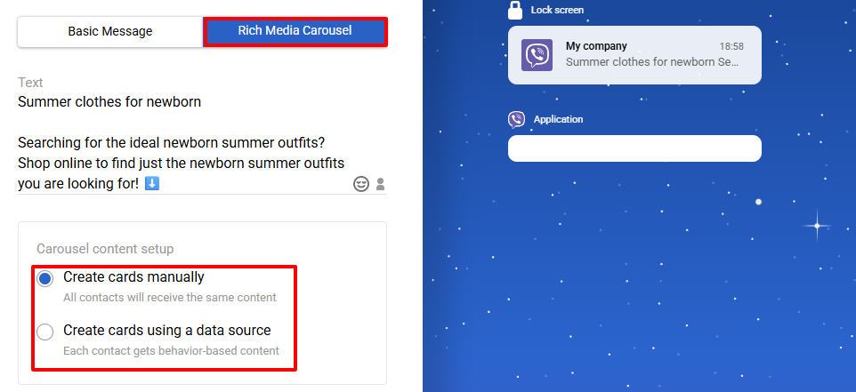 - Using a data source — each contact gets behavior-based content (for example, viewed products, abandoned cart, etc.). For more details, see the article Recommendations in Viber Messages.